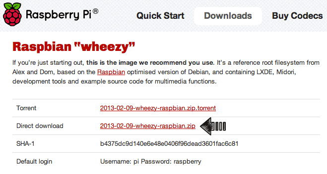 O download do Raspbian pode ser efetuado no site oficial do Raspberry Pi, sendo que a imagem [2013-02-09-wheezy-raspbian] que utilizamos durante este projeto ocupa cerca de 470Mb.