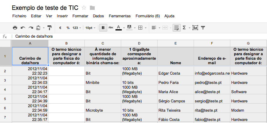 Há duas formas para disponibilizar o teste aos seus alunos: enviar o endereço por e-mail ou incorporar o formulário num website. No final, só tem de esperar que todos os alunos respondam ao teste. As respostas ficam automaticamente registadas na folha de cálculo.