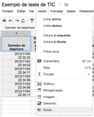 Antes de iniciar o processo de avaliação deve adicionar o Flubaroo ao formulário através do menu Inserir > Script