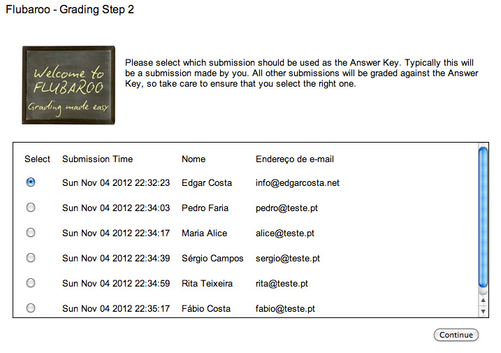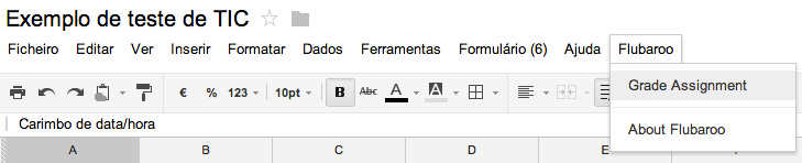 É necessário autorizar o Flubaroo antes de iniciar o processo de correção. Depois da instalação, terá um novo menu na folha de cálculo designado por “Flubaroo”. Para iniciar o processo de avaliação basta aceder ao menu e clicar em “Grade Assignment“.