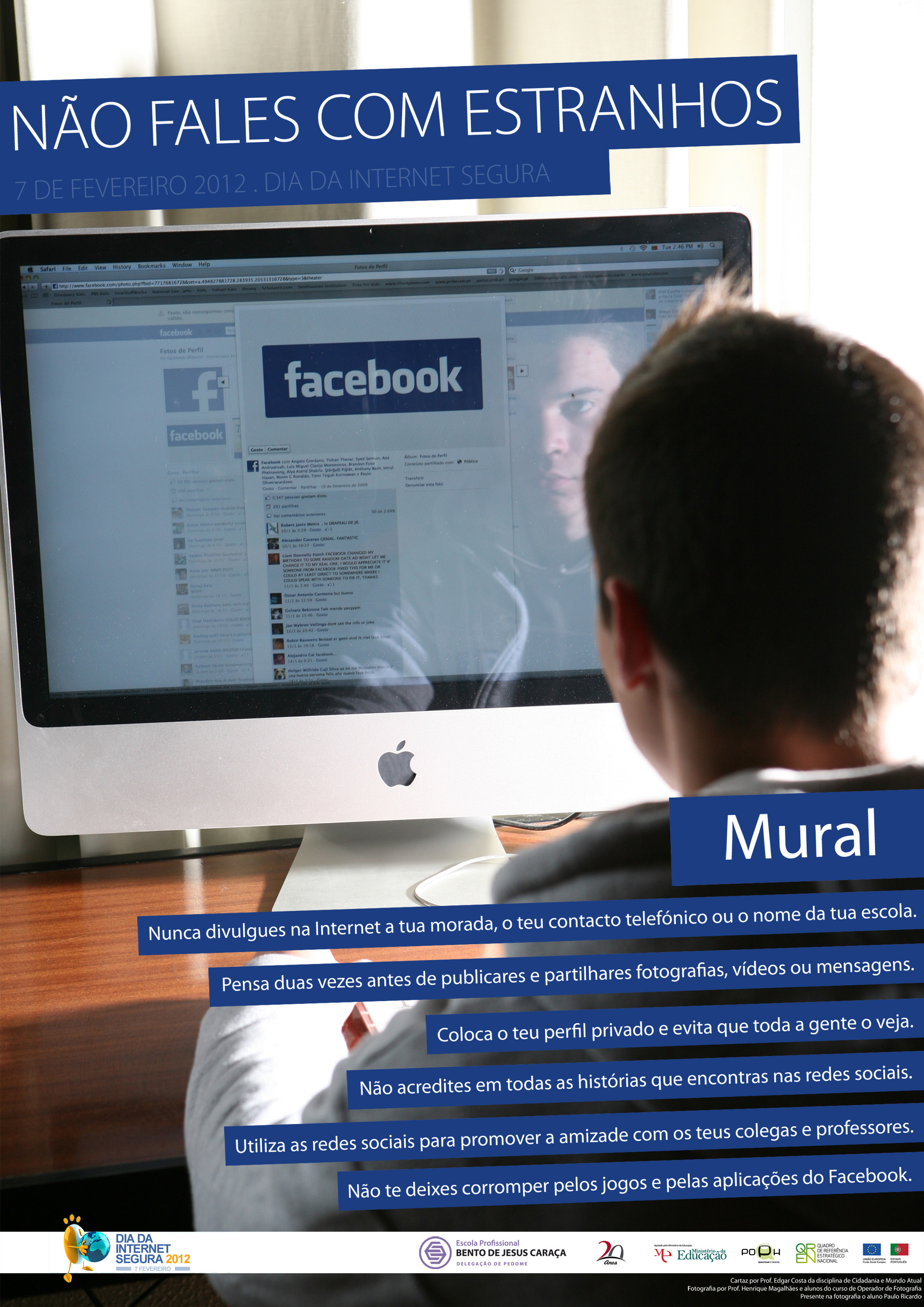 Não fales com estranhos foi o cartaz elaborado pelos alunos do Curso de Operador de Fotografia e pelos professores Edgar Costa e Henrique Magalhães da Escola Profissional Bento de Jesus Caraça (Pedome), no âmbito do Dia da Internet Segura 2012.